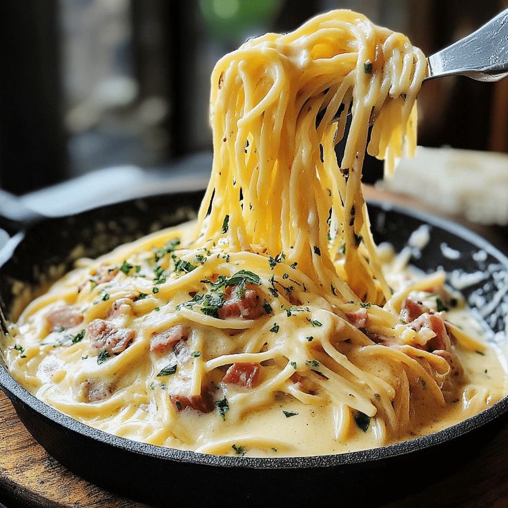 Delicioso espagueti fino bañado en salsa a la carbonara, queso parmesano y pan al ajo