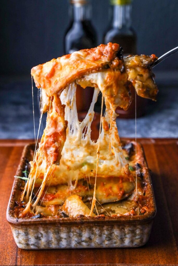 Deliciosa mezcla de champiñón bañado en salsa bechamel, acompañado de pollo al vapor, tres capas de queso mozzarella y pan al ajo